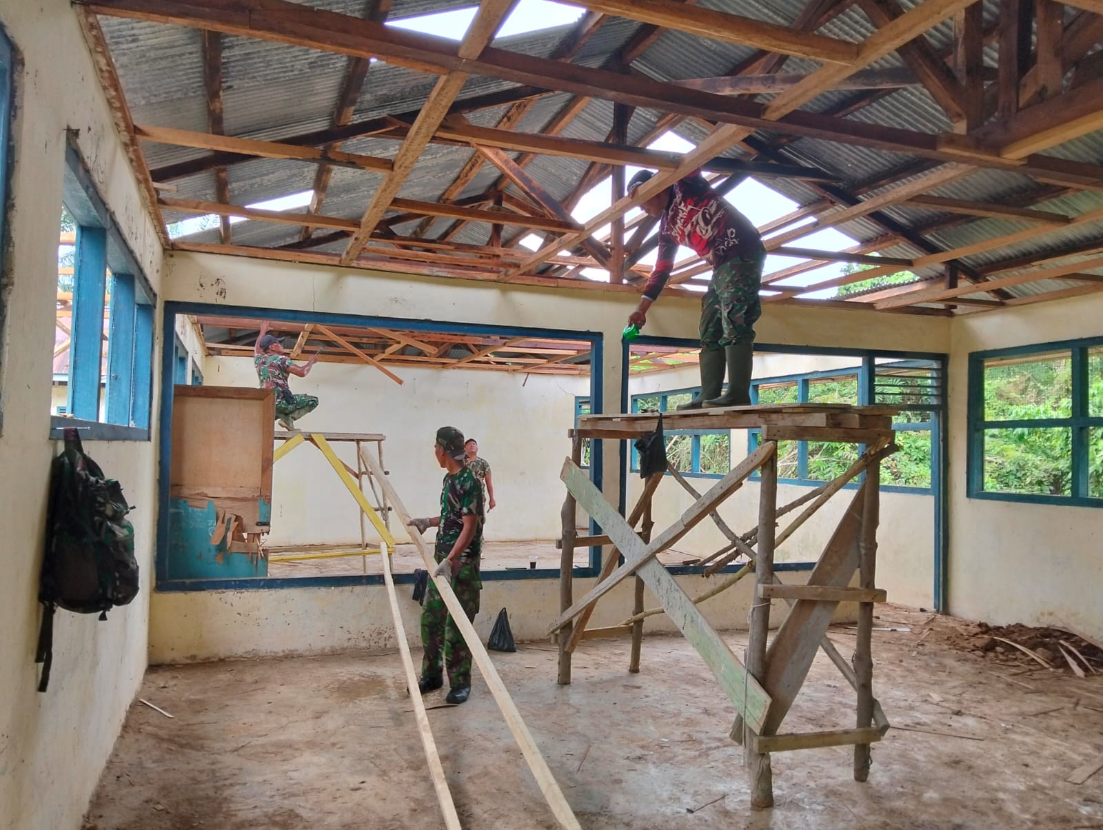 Anggota Satgas TMMD Kodim 0416/Bute Pasang Reng Plafon di Madrasah Ibtidaiyah Nurul Falah