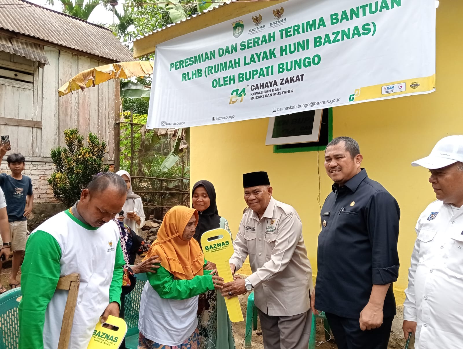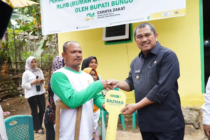 Sebagai bentuk simbolis, Bupati Bungo bersama Ketua BAZNAS Bungo menyerahkan kunci rumah kepada penerima bantuan, yaitu Bapak Sudirman, seorang warga yang dinilai berhak mendapatkan bantuan pembangunan rumah layak huni dari BAZNAS Bungo.