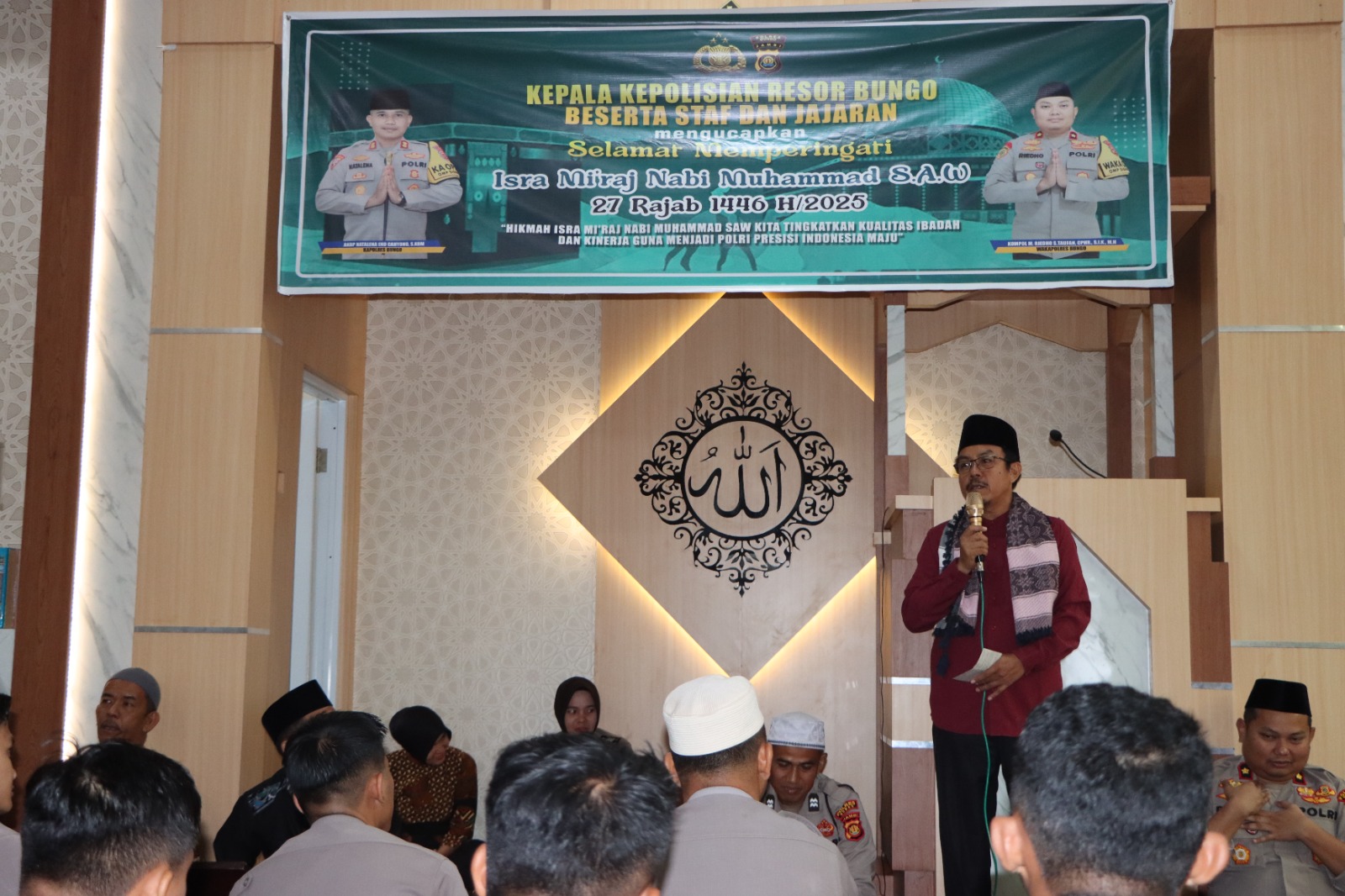 Wakapolres Bungo Kompol M.Riedho S Taufan. CPHR, S.I.K, M.H menyatakan bahwa tema peringatan tahun ini adalah “Hikmah Isra Mi’raj Nabi Muhammad S.A.W Kita Tingkatkan Kualitas Ibadah Dan Kinerja Guna Menjadi Polri Presisi Indonesia Maju”. Dalam sambutannya, Wakapolres Bungo Kompol M.Riedho menekankan pentingnya menjaga nilai-nilai keimanan sebagai landasan moral bagi setiap anggota Polri dalam menjalankan tugasnya.