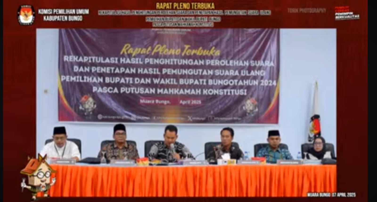 Ketua KPU Bungo, Armidis, memimpin langsung jalannya pleno rekapitulasi. Setelah seluruh hasil suara dari PSU dibacakan dan dicocokkan, Armidis mengajukan pertanyaan kepada forum, “Ok. Karena sudah sesuai, seluruh suara yang kami bacakan. Apakah dapat kita sahkan?” Mendapat persetujuan dari forum, ia kemudian mengetuk palu tanda sahnya hasil rekapitulasi. “TOK!” bunyi palu terdengar, disambut tepuk tangan peserta rapat.