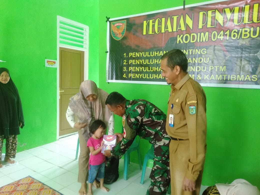 Selain penyuluhan, kegiatan ini juga dirangkaikan dengan pemberian makanan tambahan (PMT) kepada balita dan ibu hamil. Tim Kesehatan Satgas TMMD memberikan secara langsung asupan gizi berupa susu dan makanan pendukung lainnya yang bergizi serta aman untuk dikonsumsi. Satu per satu ibu hamil maju ke depan untuk menerima PMT tersebut.